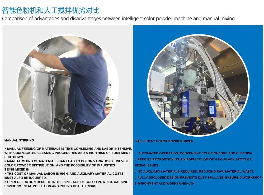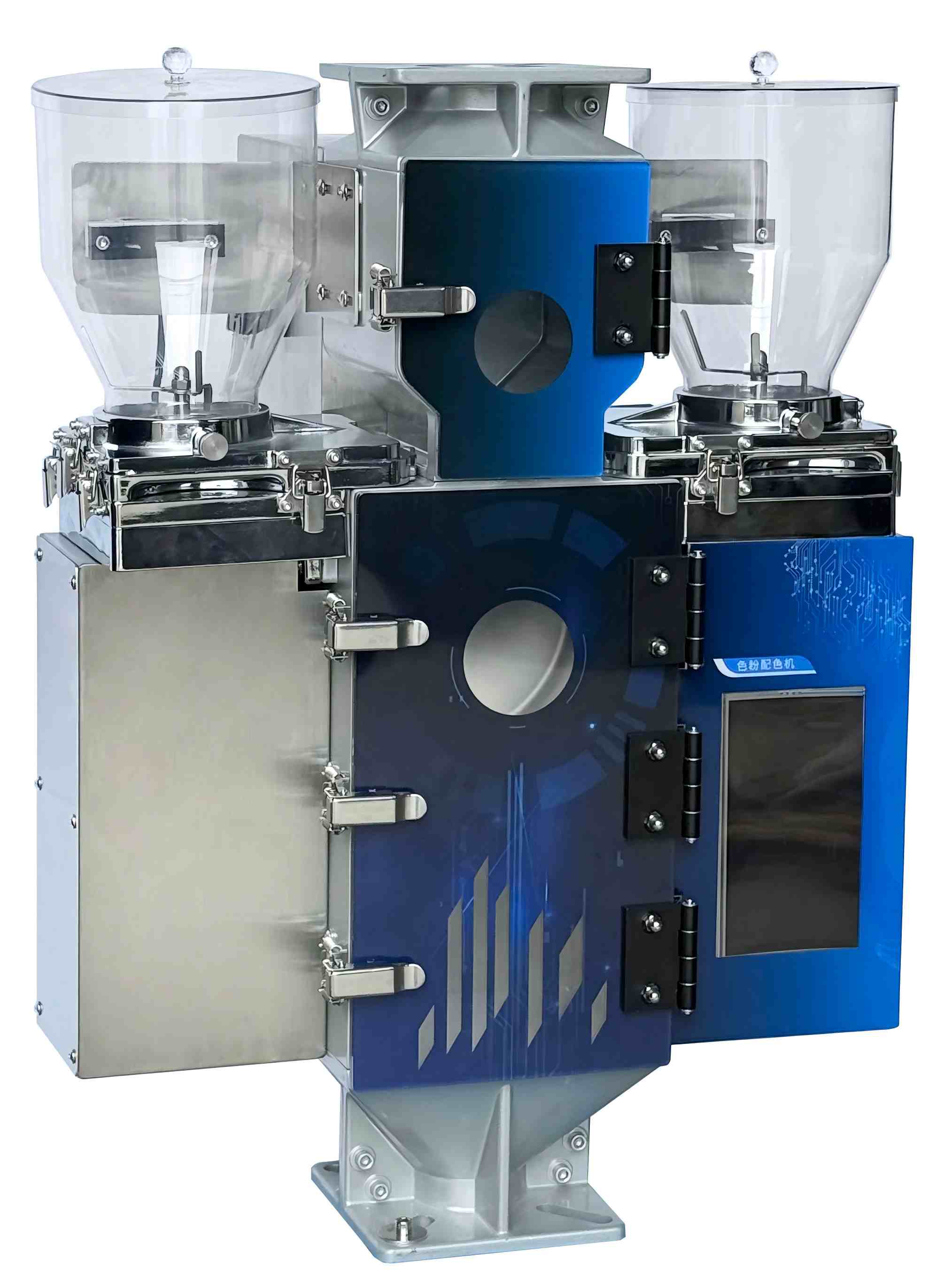 100kg/giờ"Trộn bột màu thông minh" có thể được tích hợp liền mạch với hệ thống cấp liệu tập trung, hệ thống vận chuyển trung tâm và hệ thống xử lý vật liệu tự động. Máy trộn màu nhựa được trang bị cảm biến cân có độ chính xác cao, đảm bảo tính đồng nhất của quá trình trộn và độ đồng nhất của màu sắc, đồng thời hỗ trợ tự động định tỷ lệ bột và phụ gia nhiều thành phần.